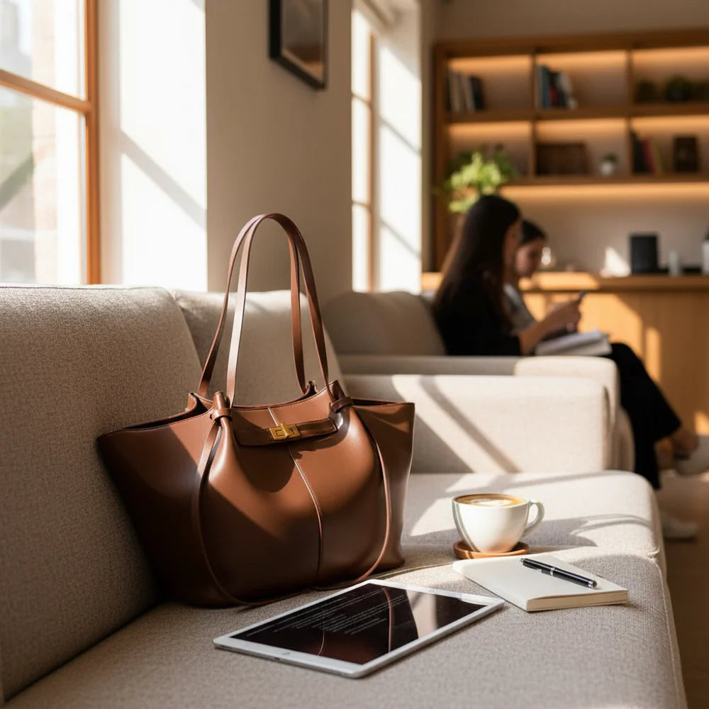 Die Tasche bietet Platz für alle wichtigen Dinge des Alltags, darunter ein 13-Zoll-Laptop, Notizbücher und eine Kosmetiktasche. Durch ihre strukturierte Form ist sie sowohl geräumig als auch elegant.
