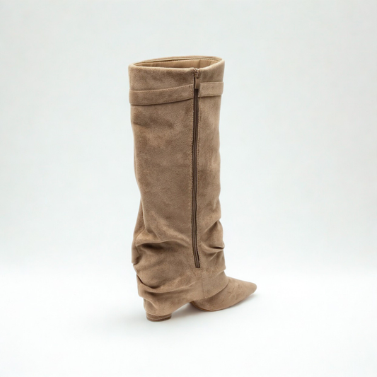 Entworfen, um zu schmeicheln. Das Zusammenspiel zwischen dem kniehohen Schnitt und der geschmeidigen Textur erzeugt sofort einen verlängernden Effekt. Im Gegensatz zu herkömmlichen steifen Stiefeln bietet der locker fallende Schaft eine moderne, unaufdringliche Eleganz, die die Beinform verfeinert und gleichzeitig volle Bewegungsfreiheit gewährleistet.