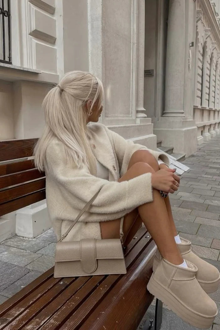 Die MINI PLATFORM-KNÖCHELBOOT SIENA bieten gemütlichen Komfort und zeitlosen Winterstil. Gefertigt aus veganem Wildleder mit weichem Kunstfellfutter, halten sie deine Füße die ganze Saison über warm und verleihen jedem Outfit einen mühelos schicken Touch.