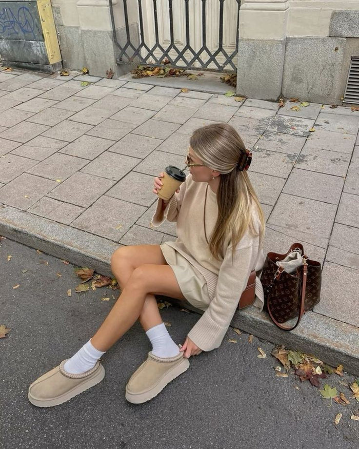 Die Platform Mules Siena vereinen gemütlichen Komfort mit mühelosem Stil. Gefertigt aus veganem Wildleder mit einem weichen Kunstfellfutter, halten sie deine Füße den ganzen Winter über warm und bequem – perfekt für gemütliche Stunden zu Hause oder für den Außenbereich.